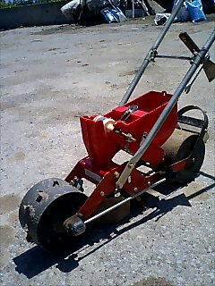 播種のやり方は色々あるようですが、ウチでは“ゴンベエ”という機械を使っています。この中に種を入れて、歩きながら手で押すわけです。本来ならそれだけでも良いようですが、一応まいた種の上に土をかけていきます。約55mのハウスの中を12往復×2回(播種と土かけ)……、けっこう疲れます。当然、播種後の圃場は足跡だらけになります。