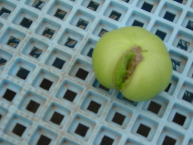 例えば、右の写真のような場合、一番上の右の小さい実は、着果が遅れたため他のモノに比べて小さくなっています。根や茎に近いのに小さい者は今後生長する可能性が低いので取り除きます。また、一番下のモノも同様に取り除きます。