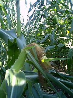 とうもろこしの上から出ているヒゲ(絹糸)のようなものは雌しべで、この1本1本が1粒1粒の実につながっているのですが、このヒゲが黒くなったら収穫の目安です。