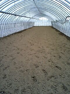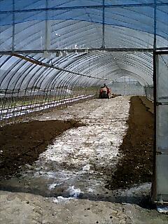 播種のやり方は色々あるようですが、ウチでは“ゴンベエ”という機械を使っています。この中に種を入れて、歩きながら手で押すわけです。本来ならそれだけでも良いようですが、一応まいた種の上に土をかけていきます。約55mのハウスの中を12往復×2回(播種と土かけ)……、けっこう疲れます。当然、播種後の圃場は足跡だらけになります。