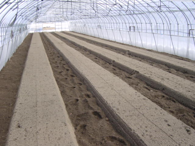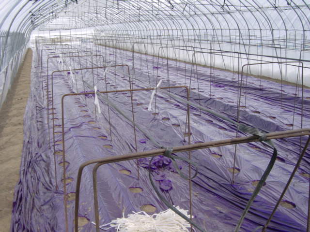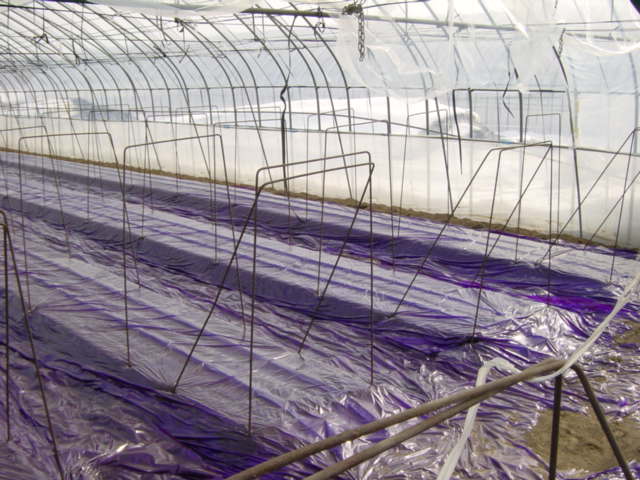 右の写真が、ハウス1棟分完成したところです。通常、ハウス1棟に3つのベッドを作るケースが多いようですが、このハウスはサイズが大きいので4つのベッドを作りました。