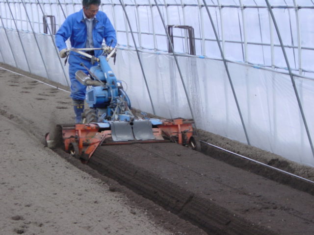 右写真のような機械を使って、ハウスの中の土を10〜20cmくらい高くしていきます。