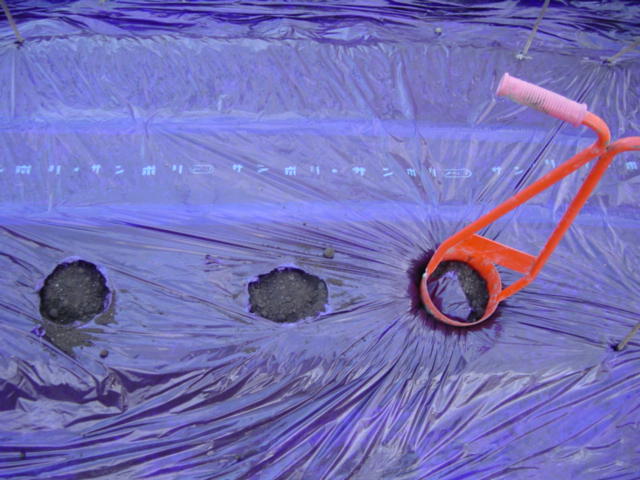 色々なやり方がありますが、ウチの場合は、マルチを張った上から丸い穴を開けています。他には、マルチを張る前に穴を開けておき、マルチを張ったらその穴の上にカッターナイフで一文字の切り込みを入れるという方法もあります。