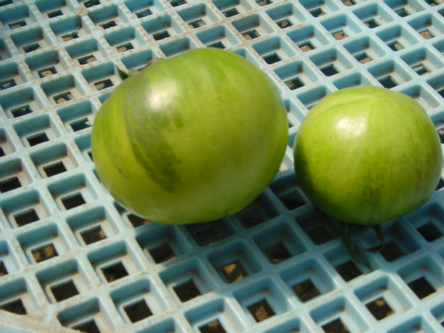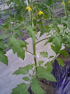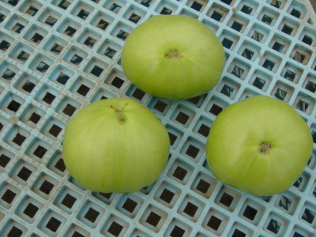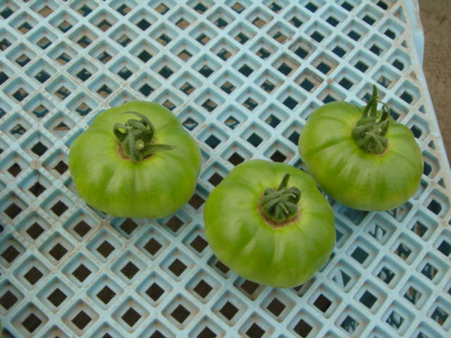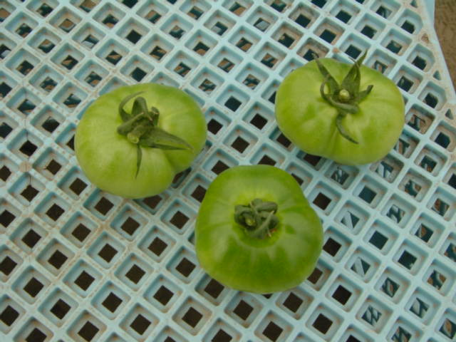 例えば、右の写真のような場合、一番上の右の小さい実は、着果が遅れたため他のモノに比べて小さくなっています。根や茎に近いのに小さい者は今後生長する可能性が低いので取り除きます。また、一番下のモノも同様に取り除きます。
